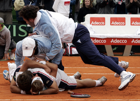cap) and Jose Acasuso (top) celebrate their victory over Australia's Wayne
