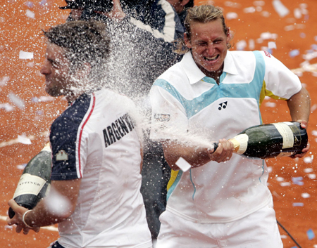 David Nalbandian (R) sprays champagne over Agustin Calleri celebrating after