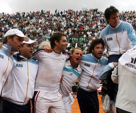 Argentina's Davis Cup team celebrates after David Nalbandian and Agustin