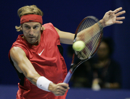 Fernando Vicente of Spain returns a shot to Croatia's Ivan Ljubicic during their first round match Thailand Open tennis tournament in Bangkok September 26, 2006.[Reuters]