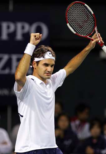 Switzerland's Roger Federer celebrates after defeating Japan's Takao Suzuki during the quarter-finals of the Japan Open tennis championships in Tokyo October 6, 2006.[Reuters]