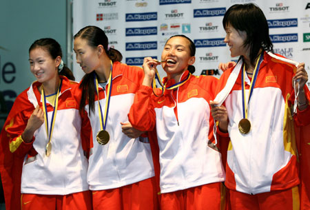 (L-R) China's Xiaojuan Luo, Na Li, Li Zhang and Weiping Zhong celebrate on the podium after winning the gold medal in the women's team epee event at the World Fencing Championship in Turin October 6, 2006. [Reuters]