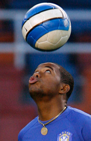 Brazil's training session (Reuters) Updated: 2006-10-10 09:36  Brazil's national soccer player Robinho heads the ball during a