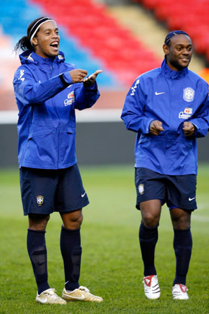 Brazil's training session (Reuters) Updated: 2006-10-10 09:36  Brazil's Ronaldinho (L) and Vagner Love joke during their