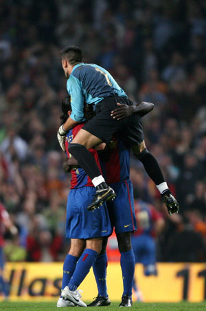 (Reuters) Updated: 2006-10-16 09:18  Barcelona goalkeeper Victor Valdes (top) and team mates