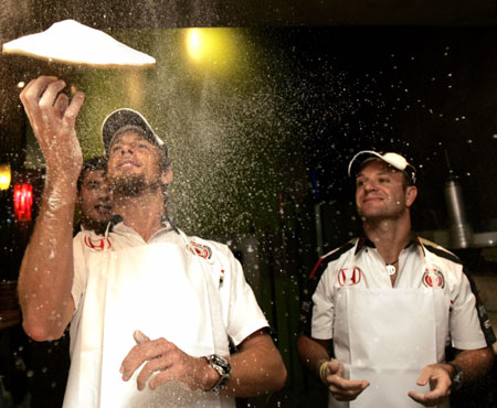 (L) and Brazil's Rubens Barrichello prepare a pizza at a restaurant in Sao Paulo