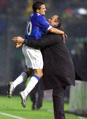 after scoring against Livorno during their UEFA Cup Group A soccer match at the