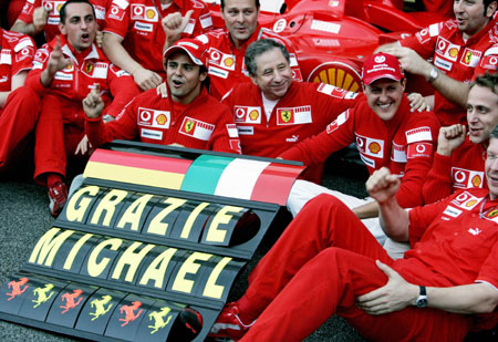 team photo with Ferrari chief Jean Todt (C), fellow driver Felipe Massa (2nd L)