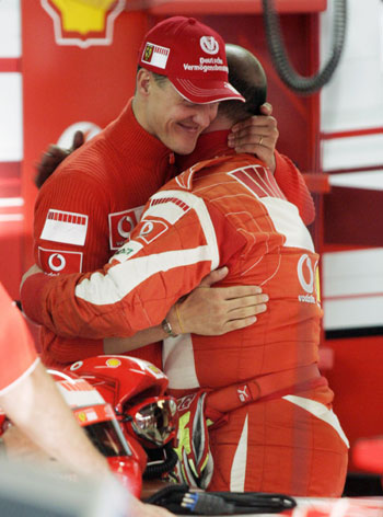 Ferrari's Formula One driver Michael Schumacher of Germany embraces a member