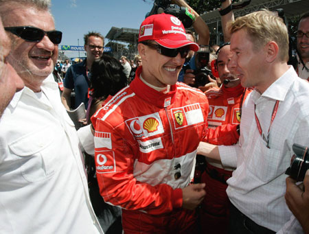 Ferrari's Formula One driver Michael Schumacher of Germany speaks with former