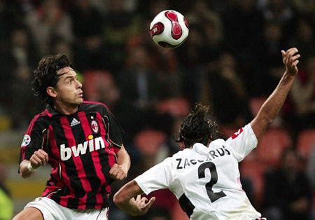 AC Milan's Filippo Inzaghi (L) challenges Cristian Zaccardo of Palermo during their Italian Serie A soccer match at the San Siro stadium in Milan October 22, 2006. [Retuers]