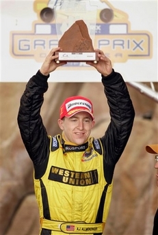 A.J. Allmendinger holds the third place trophy on the podium at the Denver