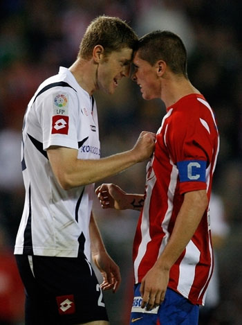 Atletico Madrid's Fernando Torres (R) and Zaragoza's Sergio Fernandez argue during their Spanish First Division soccer match in Madrid October 29, 2006. [Reuters]