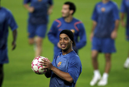 Barcelona's Ronaldinho smiles during a practice session at the Nou Camp stadium in Barcelona, northern Spain October 30, 2006. Barcelona will face Chelsea in their Champions League Group A soccer match on Tuesday. [Reuters]