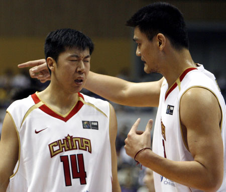 China's Yao Ming (R) and Wang Zhizhi react during their loss to Italy in the first round of the world basketball championships in Sapporo August 19, 2006. [Reuters]