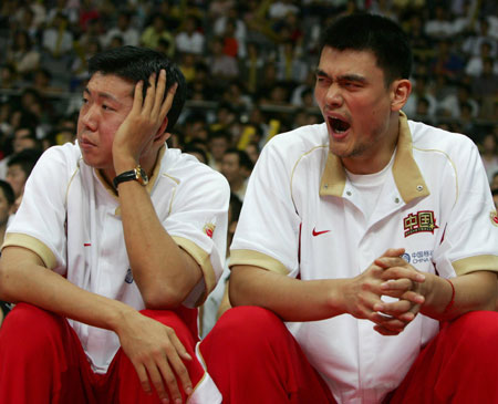 Yao Ming (R) and Wang Zhizhi watch the China men's basketball team play in the China Basketball Challenge at the Guangzhou Gymnasium, south China's Guangdong province August 7, 2006. [Reuters]