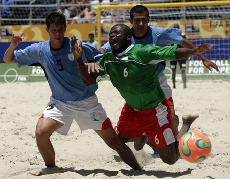 Cameroon's Valery Bithe (C) fights for the ball with Uruguay's Pamepero (L) as his team mate Coco watches during their match at the FIFA Beach Soccer World Cup 2006 at Copacabana beach in Rio de Janeiro November 6, 2006. [Reuters]