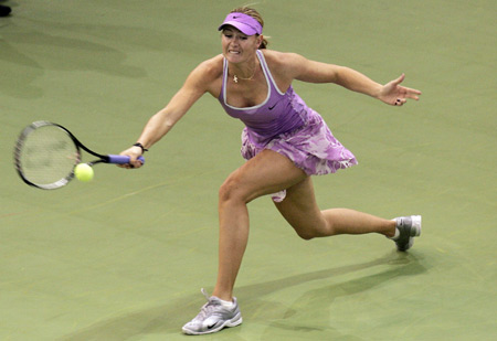 Maria Sharapova of Russia returns the ball to Kim Clijsters of Belgium during their WTA Championships tennis tournament match in Madrid November 8, 2006. [Reuters]