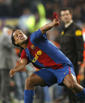 Barcelona's Ronaldinho celebrates a goal against Zaragoza during their Spanish First Division soccer match at Nou Camp stadium in Barcelona November 12, 2006. [Reuters]