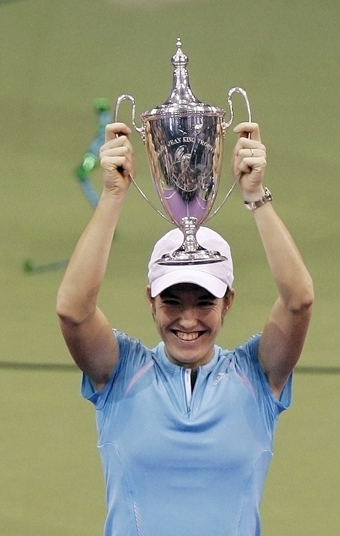 Justine Henin-Hardenne of Belgium lifts the Billie Jean King Trophy after her
