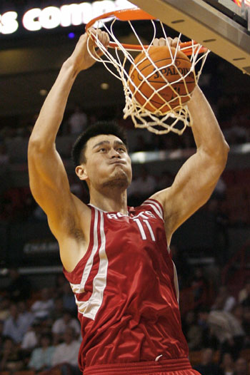 Houston Rockets Yao Ming dunks against the Miami Heat during fourth quarter NBA basketball action in Miami, Florida November 12, 2006. [Reuters]