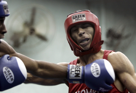 Colombia's Darley Perez Ballesta (R) is punched by Brazil's Everton Dos Santos Lopes during their 60kg gold medal bout boxing event at the South American Games (Odesur) in Buenos Aires November 14, 2006.[Reuters]