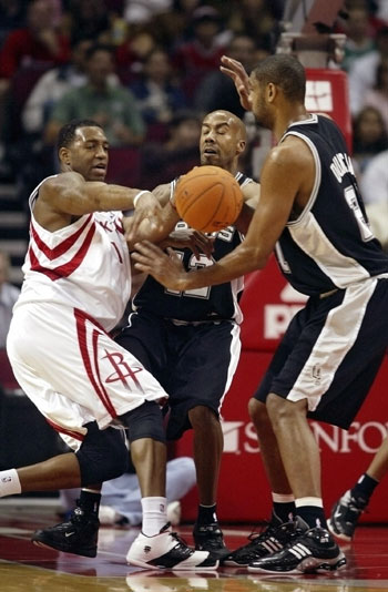 Houston Rockets forward Tracy McGrady (L) passes the ball in front of San Antonio Spurs defenders Bruce Bowen (C) and Tim Duncan in the first period of their NBA game in Houston November 14, 2006. The Spurs won 92-84 and Yao Ming got 20 points and 6 rebounds.[Reuters]
