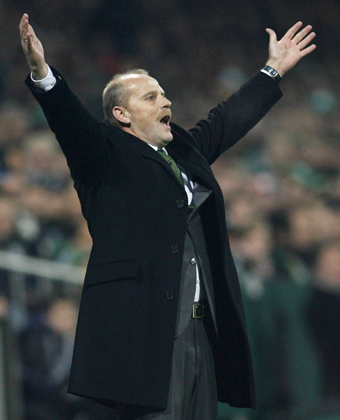Werder Bremen's coach Thomas Schaaf reacts during the Champions League Group A soccer match against Chelsea in Bremen November 22, 2006.[Reuters]