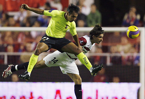 Sevilla's Julien Escud?(R) of France and Braga's Ze Carlos of Brazil head the ball during their UEFA Cup soccer match at Ramon Sanchez Pizjuan stadium in Seville November 23, 2006. [Reuters]