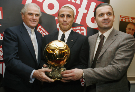pose with Italy's soccer player Fabio Cannavaro holding his Ballon d'Or (Golden