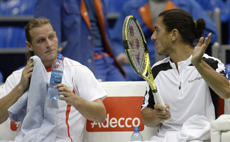 Tennis players David Nalbandian (L) and Guillermo Canas of Argentina talk