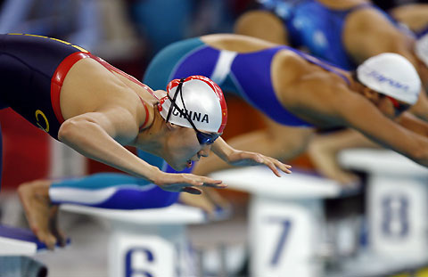 the pool during the women's 100m butterfly swimming heats at the 15th
