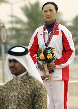Chen Li of China poses with the gold medal she won during the women's shooting 75m trap target final during the 15th Asian Games Doha 2006 at the Lusail Shooting Centre, December 2, 2006. [Reuters]
