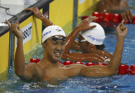 Japan's Hidemasa Sano (L) and Shinya Taniguchi celebrate after coming in first and second place respectively during the finals of their men's 400m individual medley swimming competition at the 15th Asian Games in Doha December 2, 2006. [Reuters]