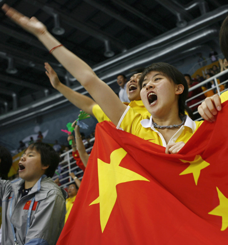 Chinese fans cheer as they watch the men's 4x100m freestyle relay swimming finals at the 15th Asian Games in Doha December 5, 2006. [Reuters]