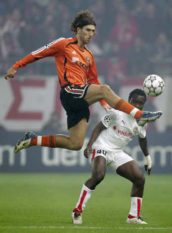 Shakhtar Donetsk's Dmytro Chygrynskiy (L) jumps for the ball against