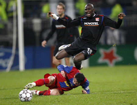 Olympique Lyon's Alou Diarra (top) challenges Steaua Bucharest's Mirel Radoi