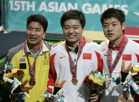 ceremony after the men's singles snooker competition at the 15th Asian Games in