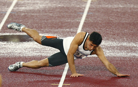 Iraq's Hareth Saleh falls during the men's 100m race first round heats at the 15th Asian Games in Doha December 8, 2006. [Reuters]
