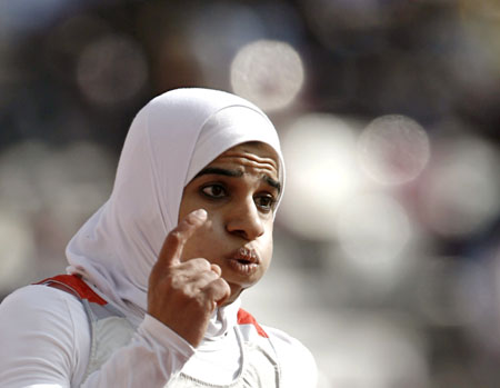 Bahrain's Ruqaya Al-Ghasara reacts after the women's 200m race heats at the 15th Asian Games in Doha December 10, 2006. [Reuters]