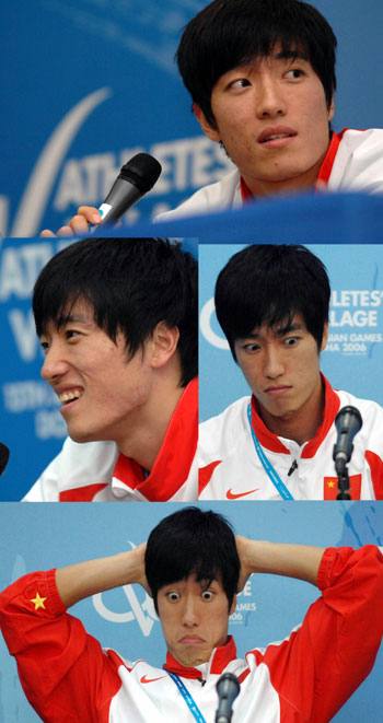 A combined photo shows China's 110 meter hurdles sensation Liu Xiang's interesting expressions at a press conference at Doha Asian Games Deceber 11, 2006. [Xinhua]