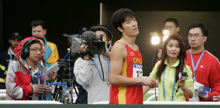 A television crew films world record holder Liu Xiang of China after he competed in the men's 110m hurdles first round heats at the 15th Asian Games in Doha December 11, 2006. [Reuters]