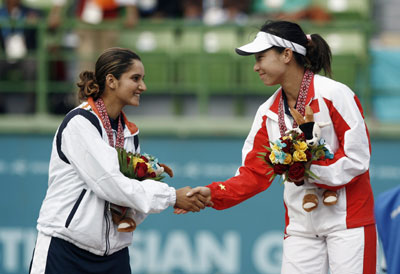 India wins two tennis titles, China crowns at women's singles(Xinhua)Updated: 2006-12-14 08:55 DOHA - The Indian fans should be content at the Khalifa Tennis Courts in Doha on Wednesday as their hero Leander Paes led a strong charge to take home two titles from the men's and mixed doubles at the Asian Games tennis tournament.