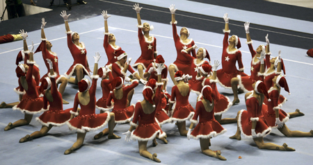 Brazil's gymnastics wearing Santa Claus costumes present the closing ceremony