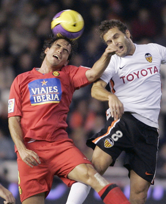 Real Mallorca's Jordi Lopez and Valencia's Ruben Baraja jump for the ball