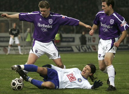 Hertha Berlin's Serbian forward Marko Pantelic is tackled by Joe Enochs (R)
