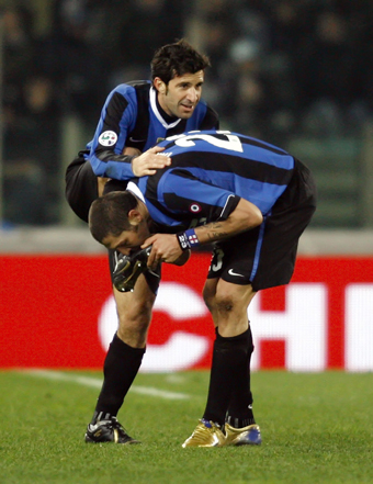 Inter Milan's Marco Materazzi (R) kisses team mate Luis Figo's shoe after