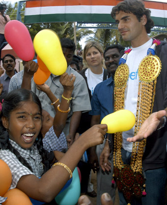 Federer (R) at a school in Thazanguda village of Cuddalore, about 165 km (103