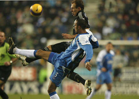 Wigan Athletic's Fitz Hall (in blue) challenges Chelsea's Arjen Robben for
