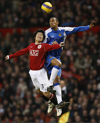 | Manchester United's Park Ji-Sung (L) challenges Wigan Athletic's Fitz